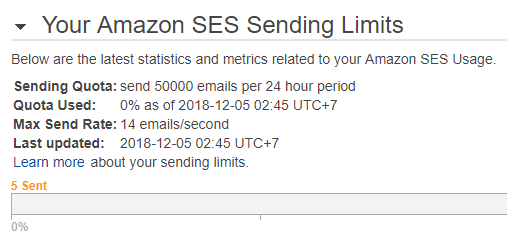 Nói thế chứ với các dịch vụ to, kiểu Google Cloud Platform hay Amazon Web Services hệ thống của nó rất nhiều, nên với ai quen thì còn đỡ, còn ai nhảy vào phát nói ngồi tạo cái SMTP từ SES thì khá đuối đấy, tạo tài khoản, xong verified tài khoản, add card, rồi mở request để dùng SES … các bước thì bạn nào cần google hé, mình chỉ nói sơ bộ thế thôi, vì rất nhiều người viết rồi, tiếng Việt, Tiếng Anh đủ cả, search là thấy hết, tài khoản của mình thì đang ở mức cho gửi đi 50.000 email mỗi ngày 😛
