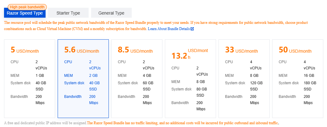 Tencent Lighthouse rất giống 1 bản nâng cấp của Amazon Lightsail, cụ thể gói Razor Speed ở giá $5.6/month không giới hạn băng thông, có cấu hình khá tương tự với Lightsail $7/month, nhưng CPU, RAM nhiều hơn, khỏe hơn, giá rẻ hơn … không đùa đâu, vì Lightsail, AWS quản lý CPU gắt lắm, dùng quá 5% CPU là trừ tiền ngu luôn 😅