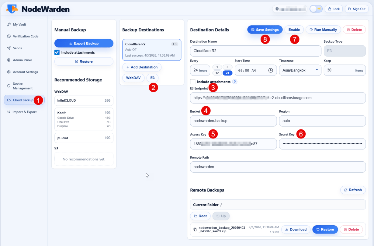 Bạn có thể vào R2 Object Storage, tạo 1 thêm 1 store để chứa các bản backup password mỗi ngày