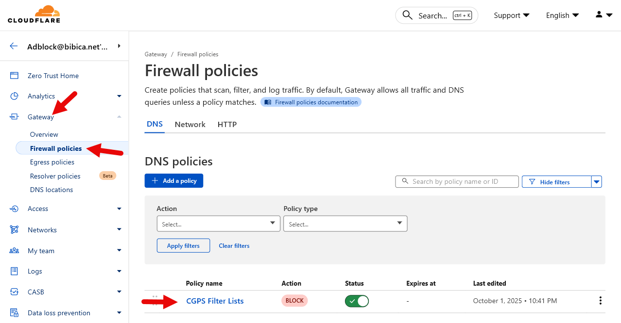 - Truy cập lại vào Cloudflare Zero Trust, Gateway -> Firewall policies, sẽ thấy bộ lọc từ Github đã được gửi sang Cloudflare