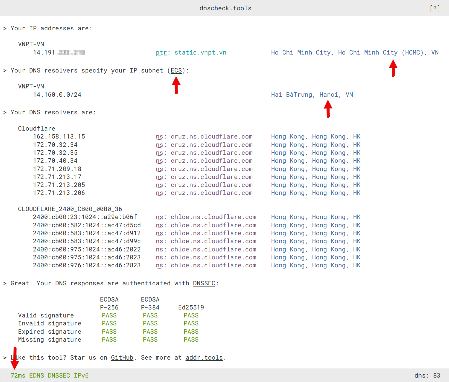 - Trên nhà mạng VNPT, DNS sử dụng Cloudflare tại Kong Kong, không có gì đặc biệt