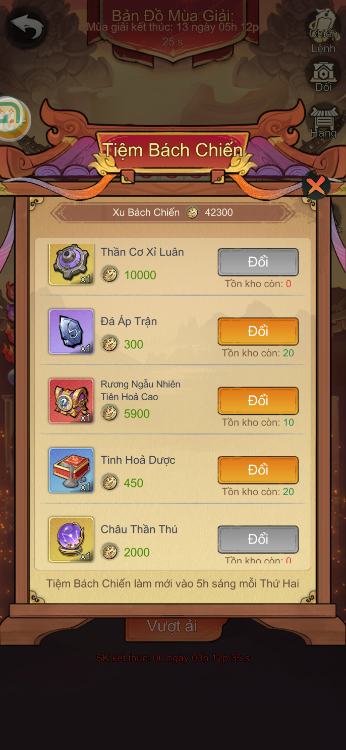 - Tiệm Bách Chiến (mở ra từ bản Hào Khí Gia Tộc): thường hàng tuần chỉ lấy Thần Cơ Xỉ Luân, đồ vàng Vô Song, Châu Thần Thú … còn lại thấy cần gì thì mua