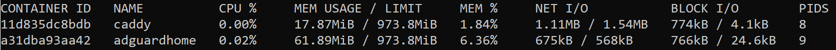 Adguard Home và Caddy khi chạy, sử dụng ban đầu ~ 80MB RAM, CPU dùng không đáng kể, về HDD ghi xuống bao nhiêu tùy thuộc số user sử dụng, ở giai đoạn đầu cần kiểm tra chất lượng dãy DNS, xem có chặn nhầm gì không, có thể lưu log kiểm tra … chạy ổn định rồi thì tắt ghi log đi cho nhẹ