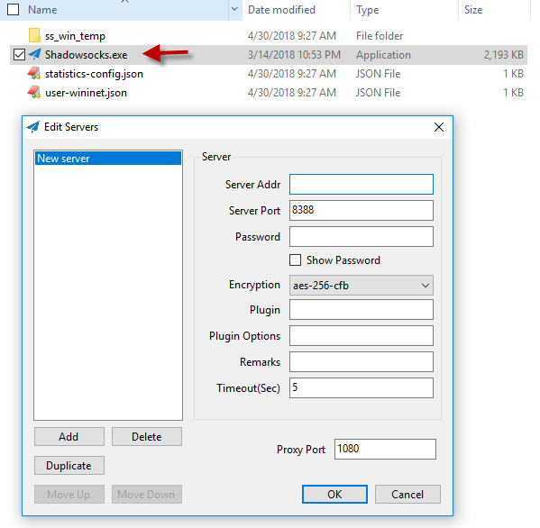 Giải nén, chạy file Shadowsocks.exe nó sẽ tự tạo thêm 1 số file config ngay trong thư mục chứa file Shadowsocks.exe, khi chạy lần đầu nó cũng tự bật phần Edit Servers để bạn thêm vào, thông tin thì khi bạn tạo Shadowsocks nó sẽ hiện ra, hoặc bạn có thể dùng tạm 1 con mình đang FREE