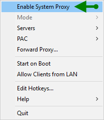 Icon nó sẽ nằm dưới taskbar và ban đầu màu xám, phải chuột vào icon đó, chọn Enable System Proxy là nó chạy rồi