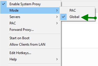 Mặc định, Shadowsocks chạy ở chế độ PAC, chế độ này thì nó chỉ dùng proxy theo danh sách các trang bạn thêm vào thôi, còn các trang không thêm vào, nó vẫn dùng IP thực để truy cập, để nhanh gọn và dùng proxy cho tất cả các trang thì bạn phải chuột vào icon, chọn chế độ Mode -> Global
