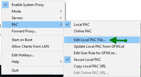 Edit file PAC bạn chỉ việc phải chuột chọn PAC -> Edit Local PAC File, nó sẽ bật cả file text chứa các domain sẽ dùng proxy, bạn thêm vào như cú pháp có sẵn là được