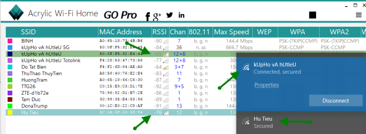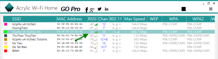 Bạn cũng có thể thấy rõ từ Acrylic Wi-Fi, dùng WiFi Bandwidth: 20 + WiFi Channel: 12 nên channel nó chỉ là 12 thôi, còn dùng WiFi Bandwidth: 40 channel nó thành 12 + 8 lun á 😀