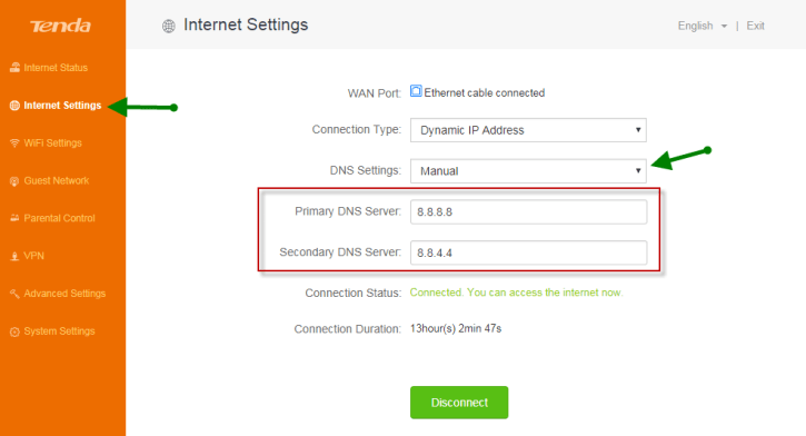 Phần Internet Settings, sử dụng DNS Google, chỉnh Primary DNS Server và Secondary DNS Server như hình là được